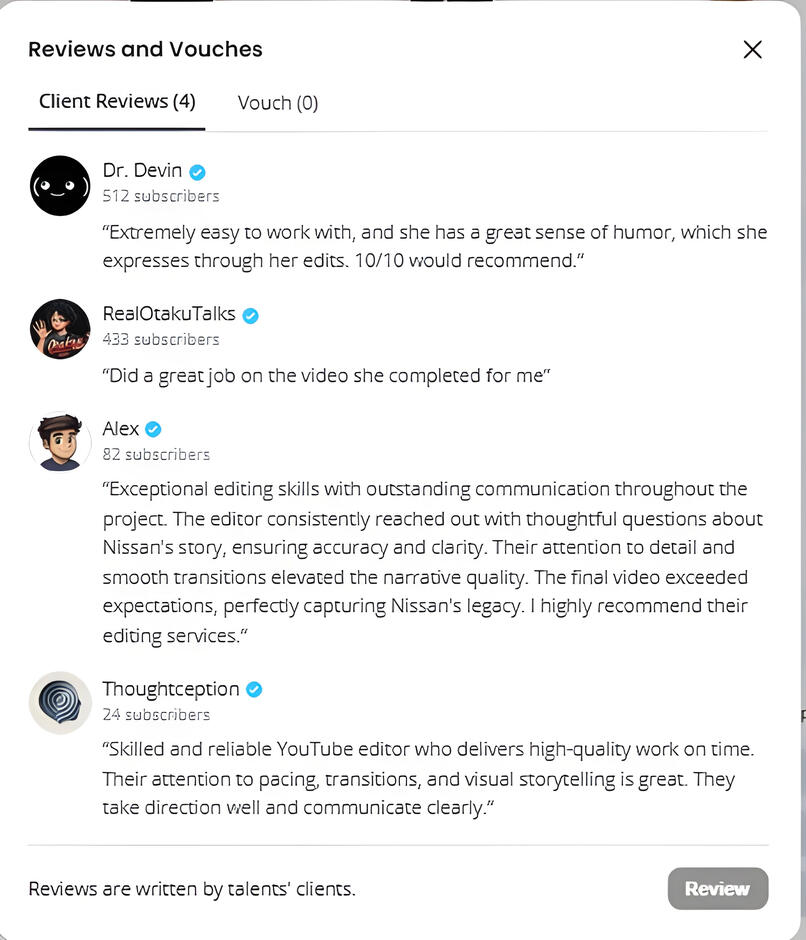 “Skilled and reliable YouTube editor who delivers high-quality work on time."